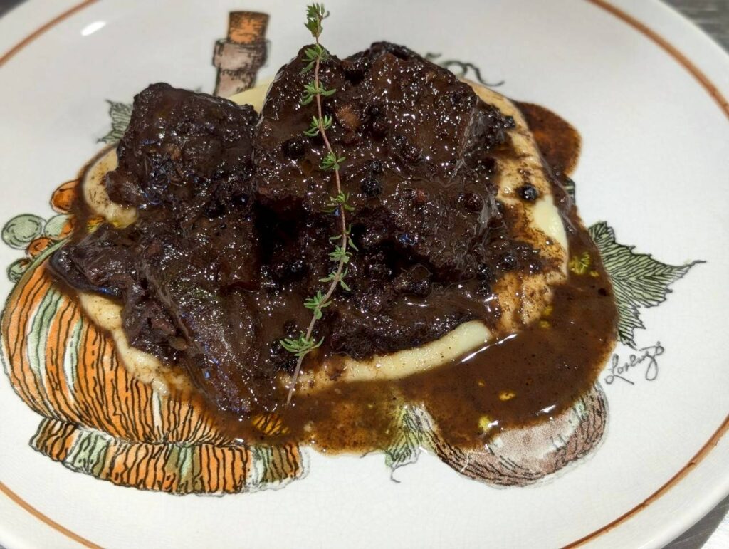えぞ鹿もも肉のステーキ黒胡椒赤ワインソース